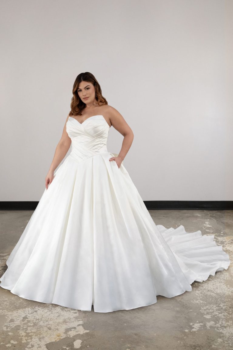 Modern Princess Plus Size Ballgown Wedding Dress with Detachable Bow Detail Modern and romantic, Style D4109 is a glamorous satin, plus size princess wedding dress ready for the runway or the aisle. An intricately draped bodice features a flattering sweetheart neckline to accentuate the impeccably tailored bodice. In the back, the Basque waist and an oversized detachable bow adds a contemporary fashion-forward touch. Majestically unfolding from waistline pleats, the voluminous ballgown skirt conceals two functional hand pockets and a dramatic long train. With contemporary details and timeless romance, this modern wedding gown makes a showstopping statement down the aisle. This wedding gown is also available in French blue.