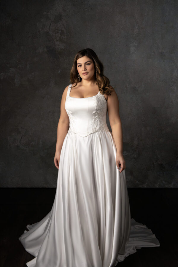 We carry select styles from each designer, and dresses often sell off the floor so availability changes regularly from what’s online.