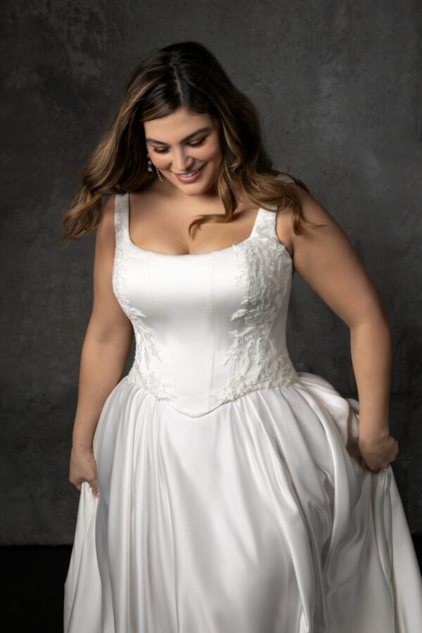 Style D4290 merges regal elegance with contemporary charm in this stunning plus size ballgown wedding dress, crafted from luxurious satin. The structured squared shoulder straps and chic square neckline frame the fitted bodice, which is beautifully defined by architectural seams and oversized beaded lace appliqués that highlight the angled Basque waistline. From there, a voluminous gathered satin skirt flows outward, creating a breathtaking ballgown silhouette for the modern princess bride on her special day.