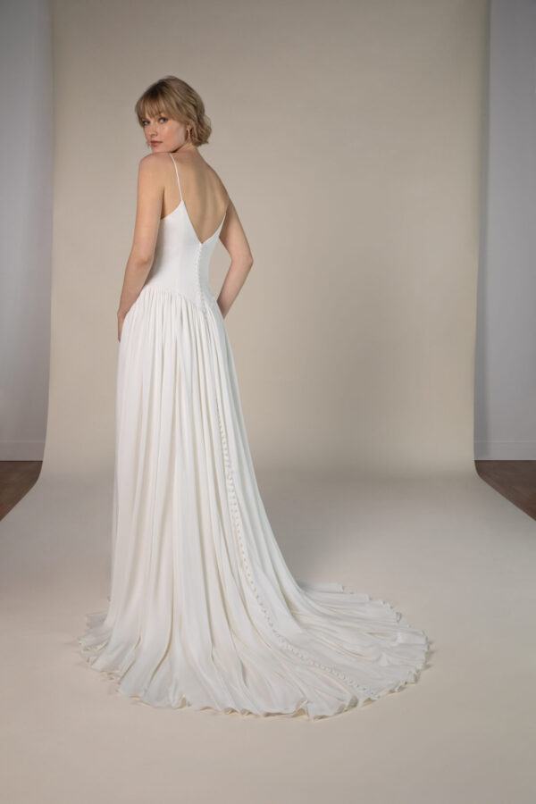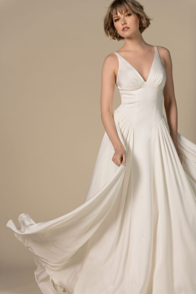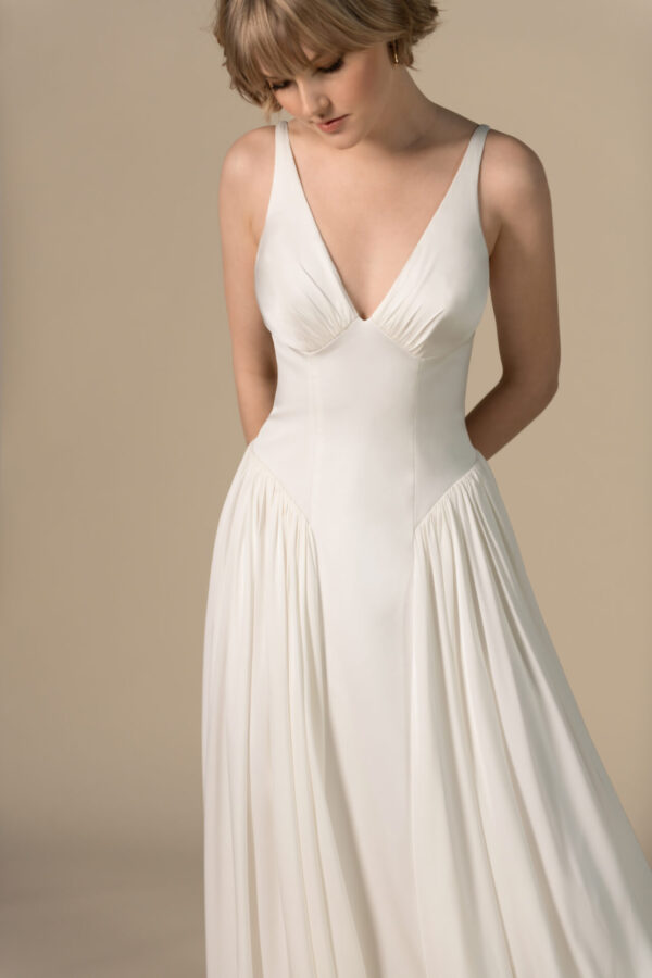 Reminiscent of 1920s style wedding dresses, the gisele gown radiates timeless elegance from its dropped waist design to its elegant silk construction. Sleek shoulder straps dip into a deep V-neckline bodice that gathers at the bust and outlines the natural hourglass figure with a free-flowing A-line silhouette. This simple wedding gown cascades into a sea of silk with gathered panels at the hip and long flowing layers extending to the romantic sweeping train. For a vintage boho wedding dress with modern sensibilities, this no lace bridal gown offers a fashion-forward look for the chic romantic bride.