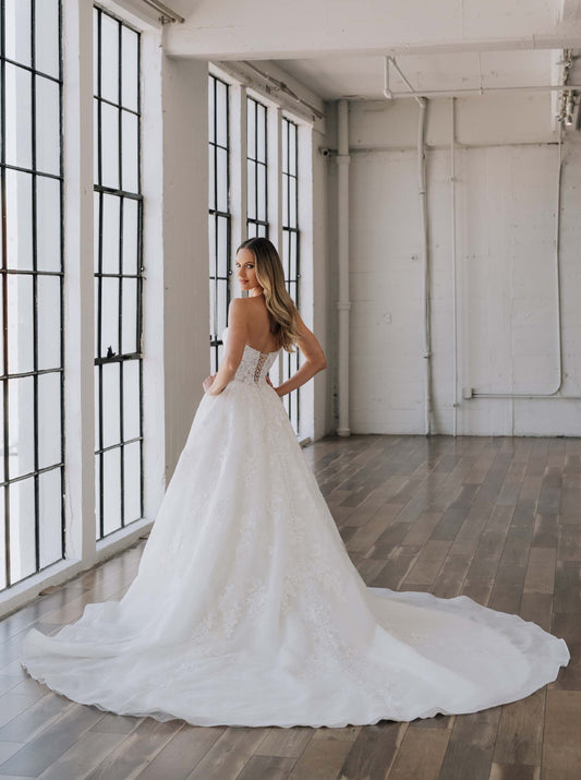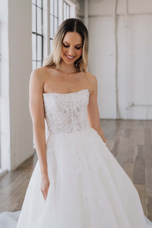 Grace is a classic yet modern choice for the romantic bride on their special day. It features an organza base with layers of floral lace that fade down the skirt, creating depth and texture. With traditional buttons to the train tip and bugle beading on the bodice, this dress exudes elegance. Her sheer bodice and modest neckline with sexy side points ensure a comfortable fit. Perfect for any season and venue, this dress will make any bride feel beautiful and confident on her wedding day.