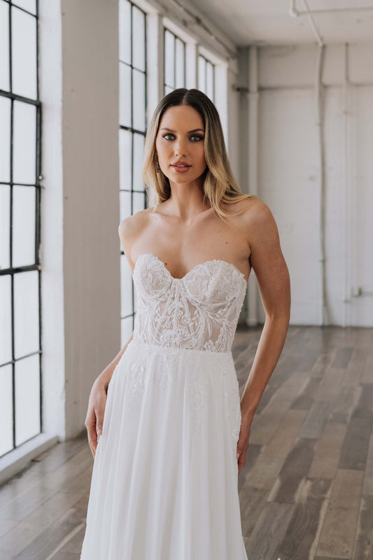 Katerina offers a classic look for brides, perfect for beach or garden weddings. With a bustier bodice featuring sheer fabric and hand-beaded detailing, she exudes a touch of sexiness. Her flowing chiffon skirt showcases wildflower appliqués that create a beautiful and unique design, fading down the skirt and crawling up the hem. Her timeless design is guaranteed to make any bride feel beautiful and confident.