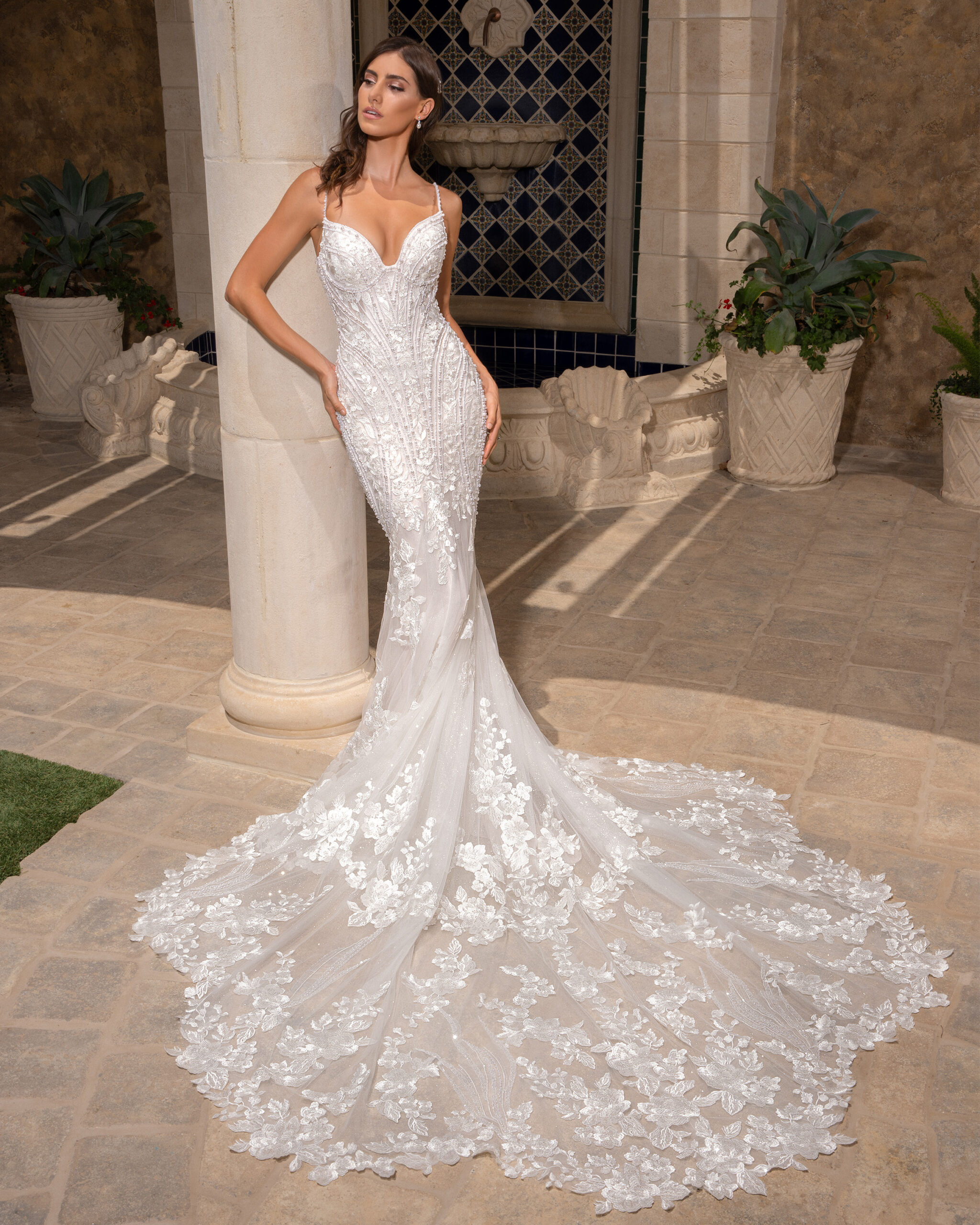 We carry select styles from each designer, and dresses often sell off the floor so availability changes regularly from what’s online.