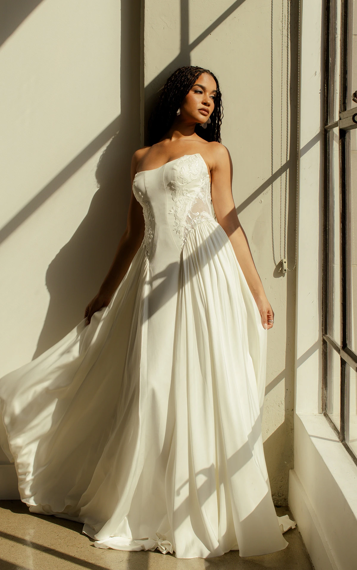 Timeless elegance and contemporary sophistication meet in the margo gown, a vintage-inspired lace wedding gown that exudes unforgettable charm. The strapless sweetheart neckline and corset fit form a sculpted bodice in sheer Chantilly lace, artfully embellished with subtle sequins and pearl beads that softly shimmer with each movement. A detachable peplum waist accessory offers a versatile bridal look for the fashion-forward bride as the fitted column silhouette hugs the figure before gently flaring at the knee to complete this glamorous vintage lace wedding gown.