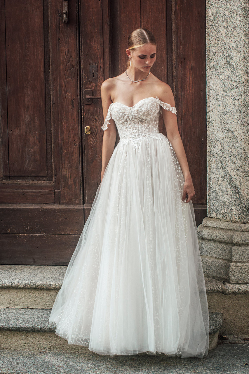 Our delicate Hopkins gown is composed of multilayered tulle skirting, which offers a peek at the dimensional sparkling floral fabric featured along the off-shoulder bodice.