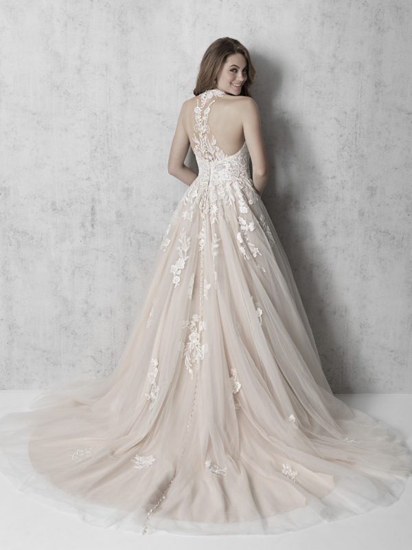 Floral appliques create a raceback effect against the illusion back of this gown.