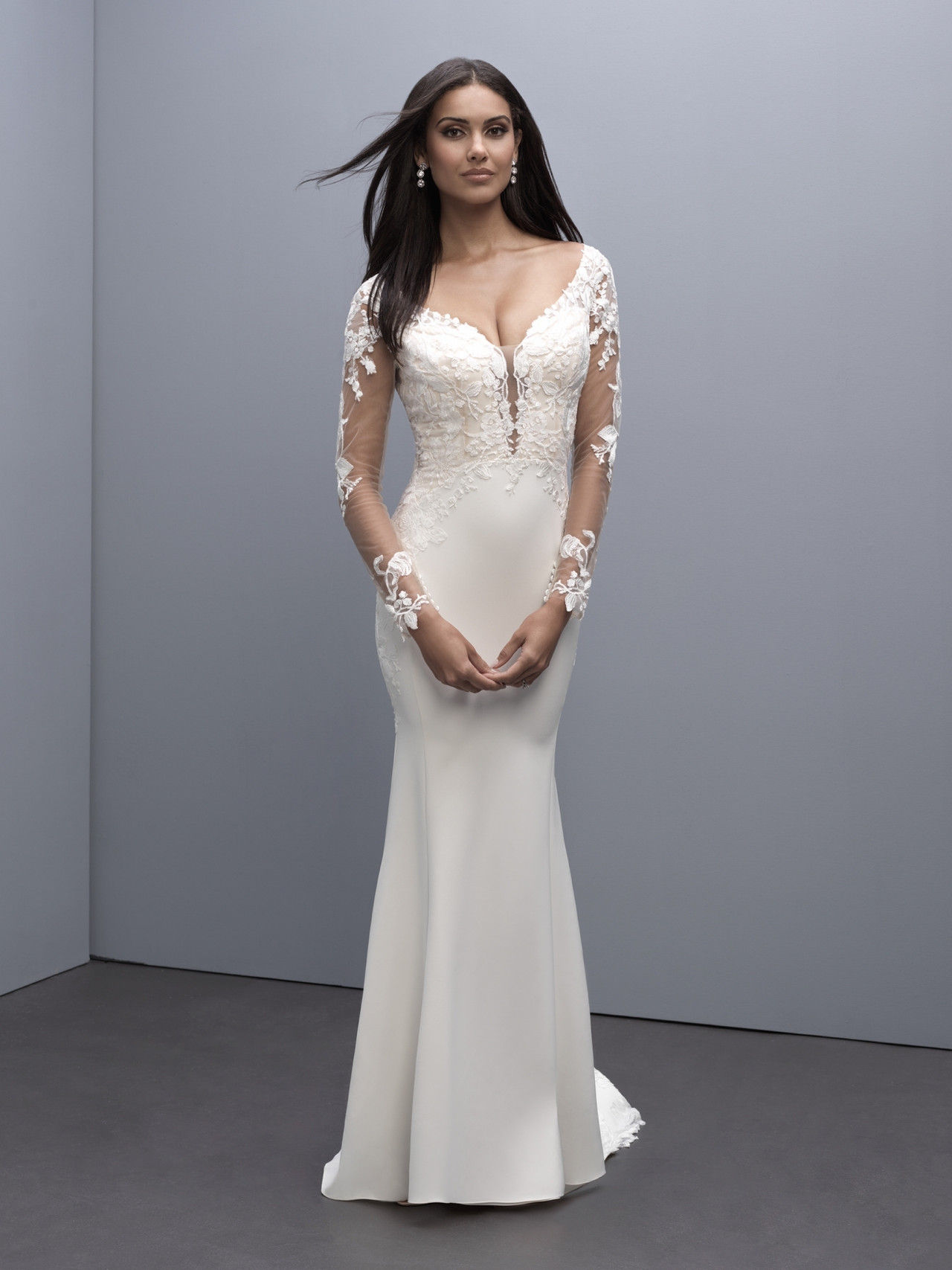 An eye-catching lace train beautifully balances the slim lines of this silky sheath gown.