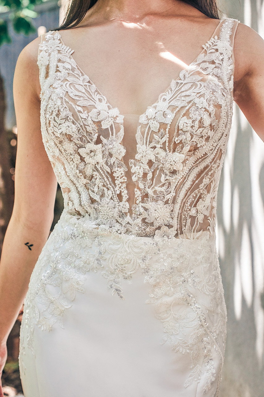 Sequined floral appliqués adorn Liberty’s illusion bodice and sheer hemline.