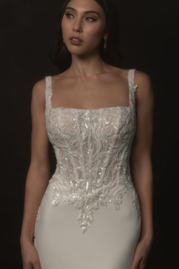 Delicate lace and intricate details define this stunning column wedding gown, bringing a touch of vintage charm to contemporary bridal fashion. Beaded spaghetti straps frame a square neckline, leading to a sheer corset bodice adorned with graphic lace appliqués that softly curve over the Basque waist. A stunning low illusion open back detail dips to the waist, showcasing a gown-length row of fabric-covered buttons. The clean and luxurious crepe fabric glides over the figure, allowing the lace accents to frame the silhouette as subtle lace appliqués scatter along the column skirt to meet a beautifully shaped lace train that cascades down the aisle for an ethereal and romantic bridal look.