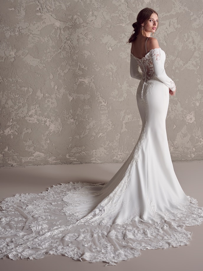 Long Sleeve Crepe Bridal Gown With Sweetheart Neck And Intricate Illusion Lace Back